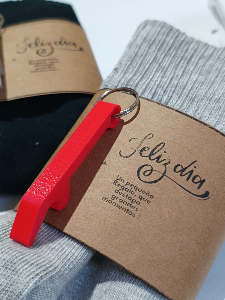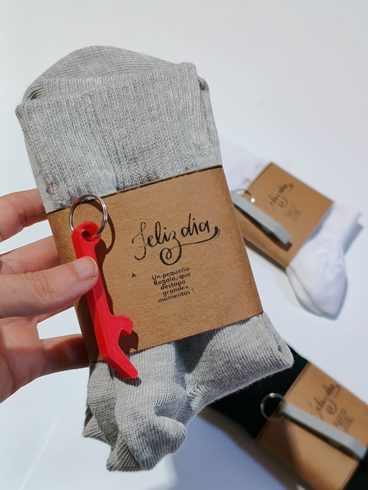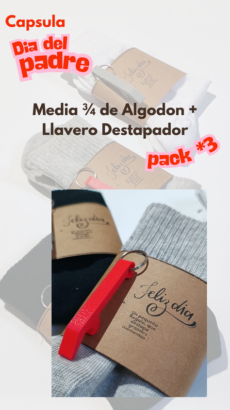 Las medias 3/4, en tonos clásicos, son de algodón suave y resistente. El llavero 3D, además de ser un destapador funcional, es ese guiño simpático que convierte un regalo simple en uno inolvidable.