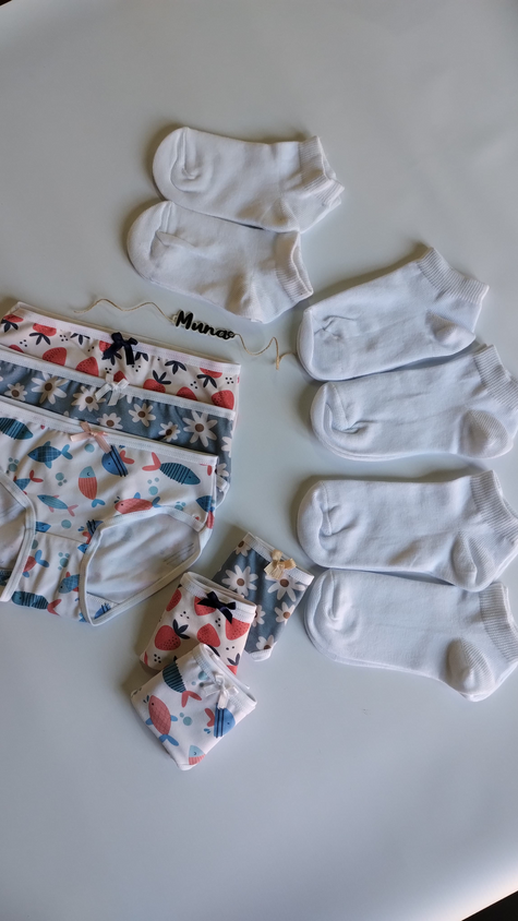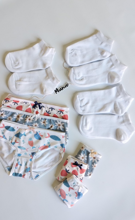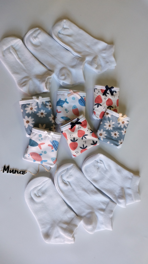 6 bombachas estampadas + 6 pares de Soquetes blancos